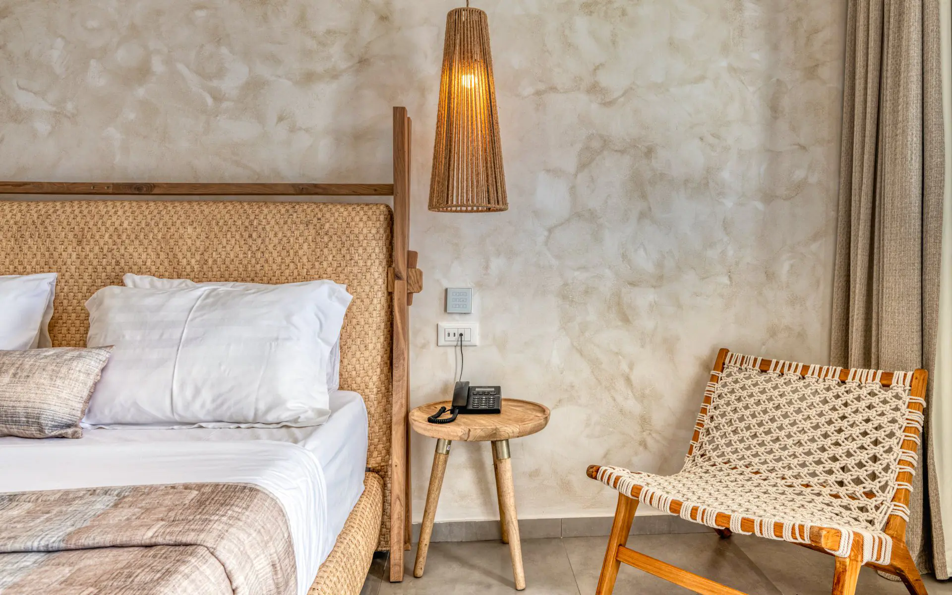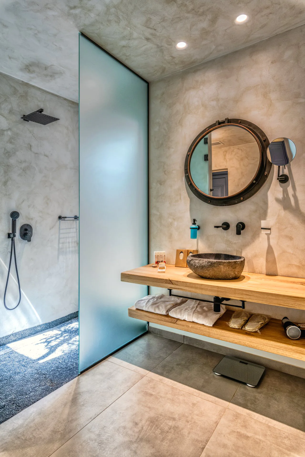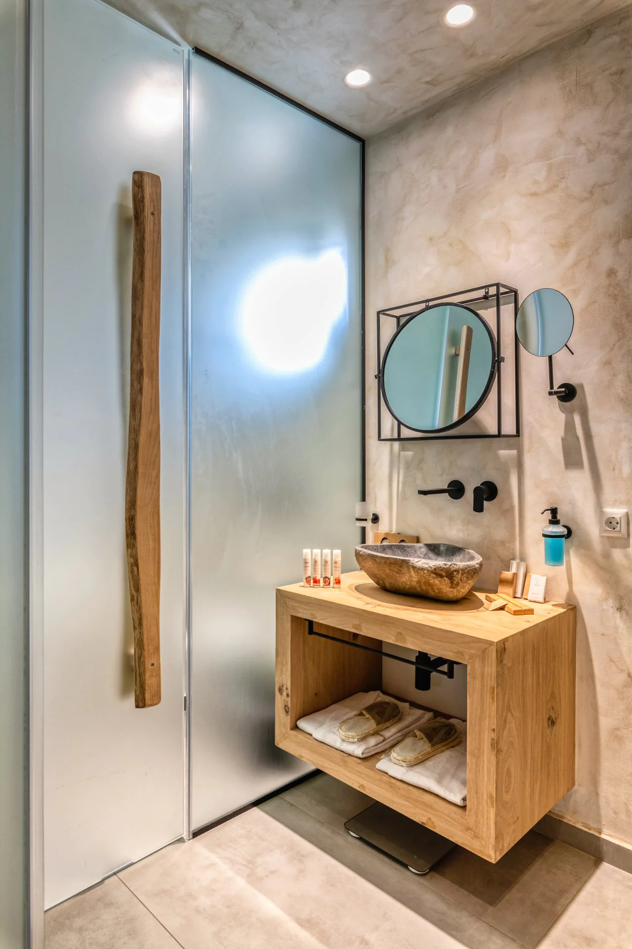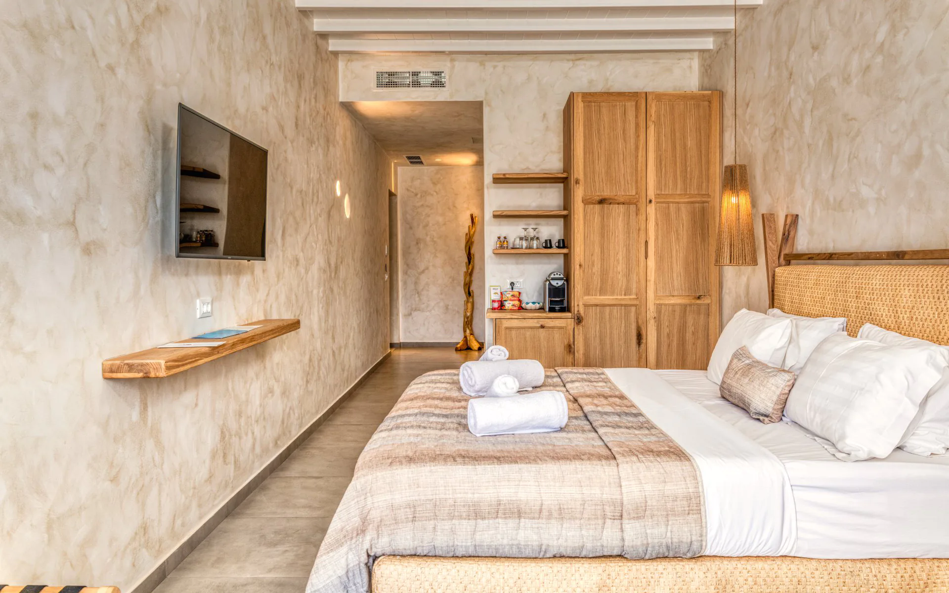 Located on the first floor the superior double rooms with private pools are decorated with earth-toned colors making them soothing to the eyes. Lay on the double king size bed and let the comfort of the mattress suck you in. The stylish and minimal design of the sizeable room is not limited to the indoor space. An outdoor space full of luxury surprises is waiting to be discovered. Take a dip in your private pool, or soak up the sun on your cushy sunbed while cherishing the stunning views of the sparkling sea.