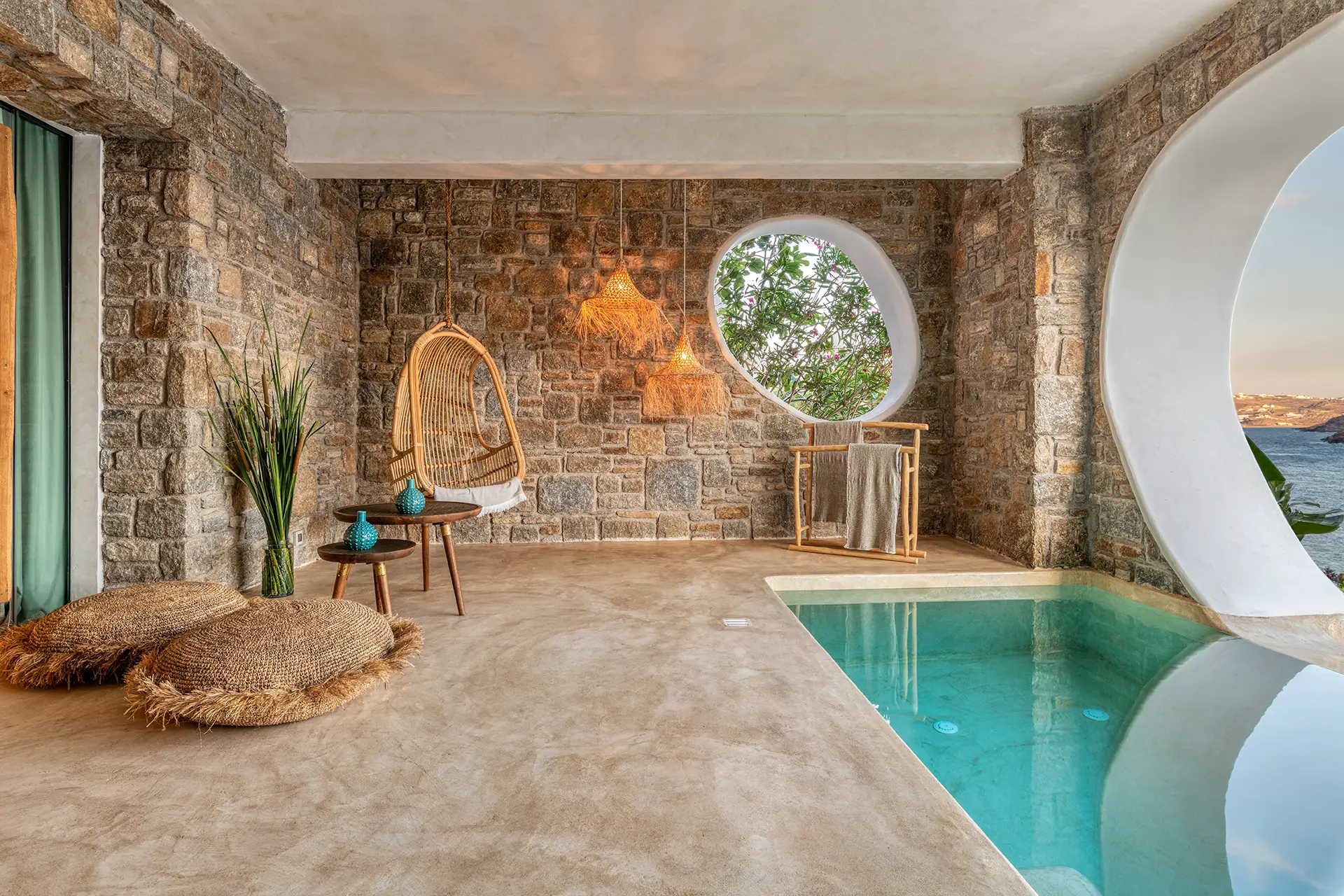 The Deluxe Suite with Private Pool’s best feature is its privacy. The road leading to this suite is far from unwanted gazes suggesting that it’s ideal for guests seeking isolation. has an elegant décor with a King size bed facing the outdoor area that is sublime creating the illusion that you are outside. Almost as big as the indoor, the exterior of this suite has a private roof terrace with your plunge pool tucked behind an oval-shaped arch so you can easily gaze at the radiant Panormos Beach. This intimate corner protects you from the winds and offers the exclusivity you seek in Mykonos.
