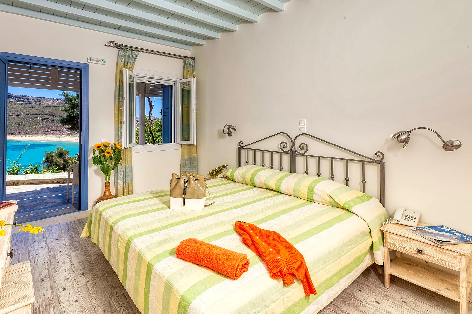 Located on the Ground Floor, these fully-equipped Standard Double Rooms will bring you joy. Boasting a summer-vibe with pops of colors and a cave-like bathroom, feel comfy in this cheerful area. Have the option of selecting a double or a twin room to make you feel even more at home. Unwind on your private terrace where you can admire the unobstructed sea views of Panormos Beach while feeling the distinct Mykonian air on your skin.